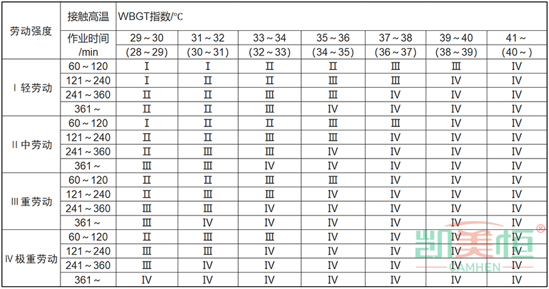 《工作場所職業(yè)病有害因素作業(yè)分級高溫》(GBZ/T229.3—2010)根據(jù)WBGT(濕球黑球溫度)指數(shù)和接觸高溫作業(yè)時間進行分級(見下表)。
