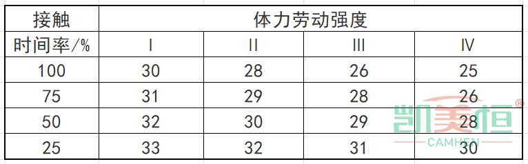 《工作場所有害因素職業(yè)接觸限值 第2部分:物理因素》(GBZ2.2—2007)接觸時間率(勞動者在一個工作日內(nèi)實際接觸高溫作業(yè)的累計時間與8h的比率)100%,體力勞動強度為Ⅳ級,WBGT指數(shù)限值為25℃;勞動強度分級每下降一級,WBGT指數(shù)限值增加1~2℃;接觸時間率每減少25%,WBGT指數(shù)限值增加1~2℃,見下表。本地區(qū)室外通風(fēng)設(shè)計溫度≥30℃的地區(qū),下表中規(guī)定的WBGT數(shù)值相應(yīng)增加1℃。