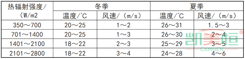 ②當(dāng)高溫作業(yè)時間較長,工作地點的熱環(huán)境參數(shù)達不到衛(wèi)生要求時,應(yīng)采取降溫措施。設(shè)置系統(tǒng)式局部送風(fēng)時,工作地點的溫度和平均風(fēng)速應(yīng)符合下表的規(guī)定。